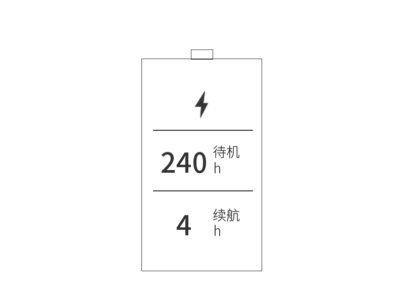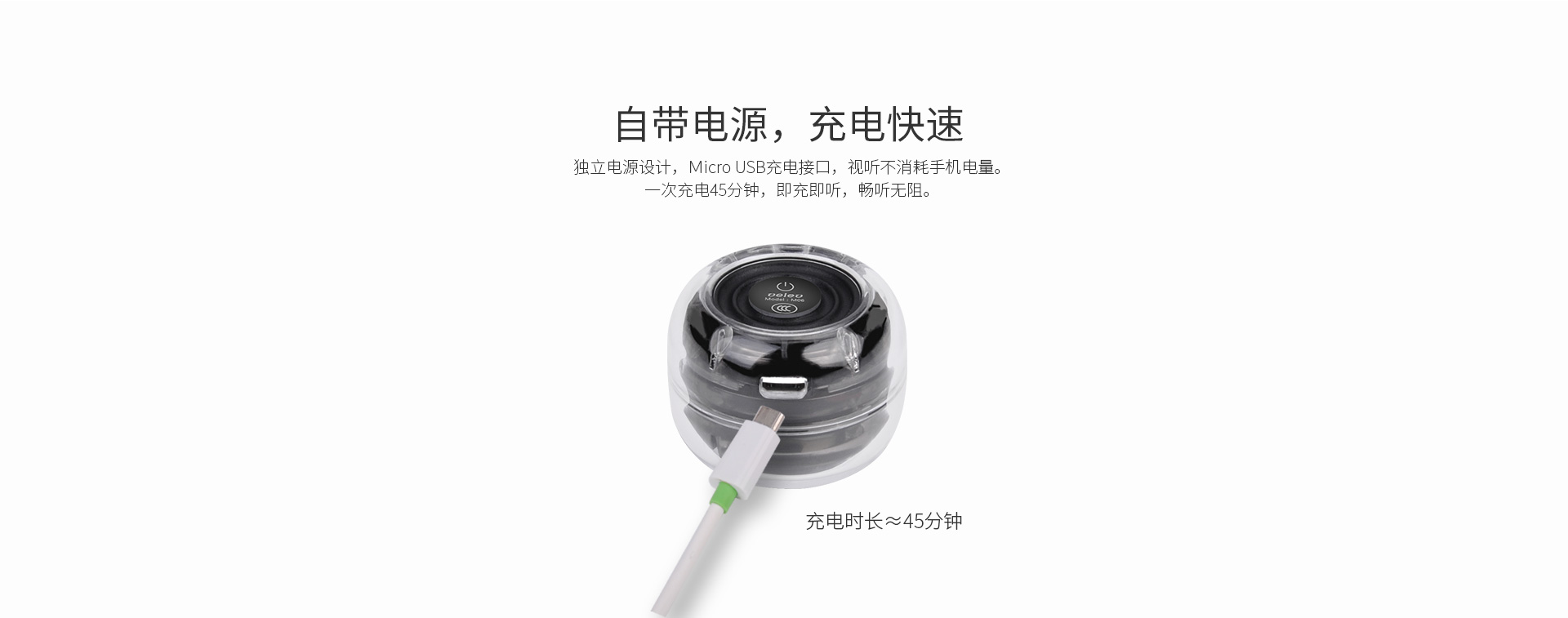 内置3.7V-250mAh高品质锂电池,一次充电可待机长达240多小时,持续播放可达4小时,小而强大。